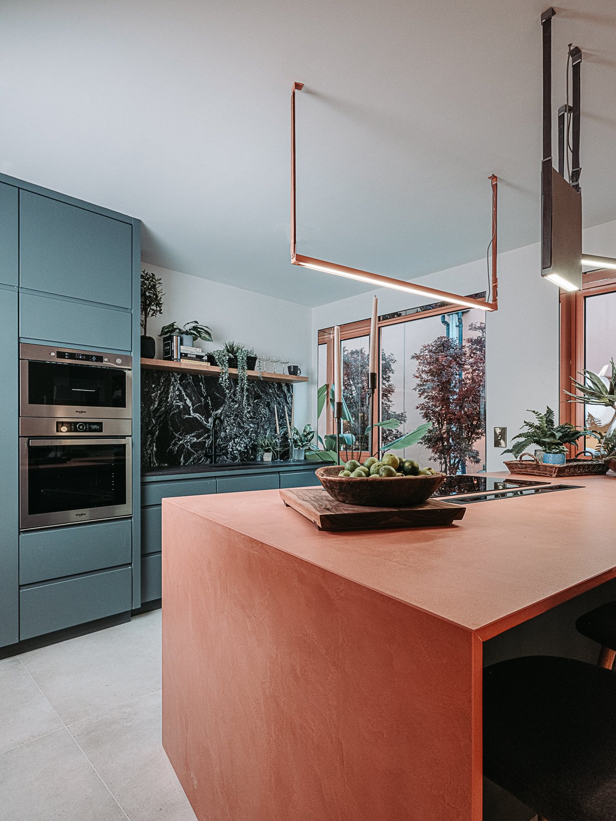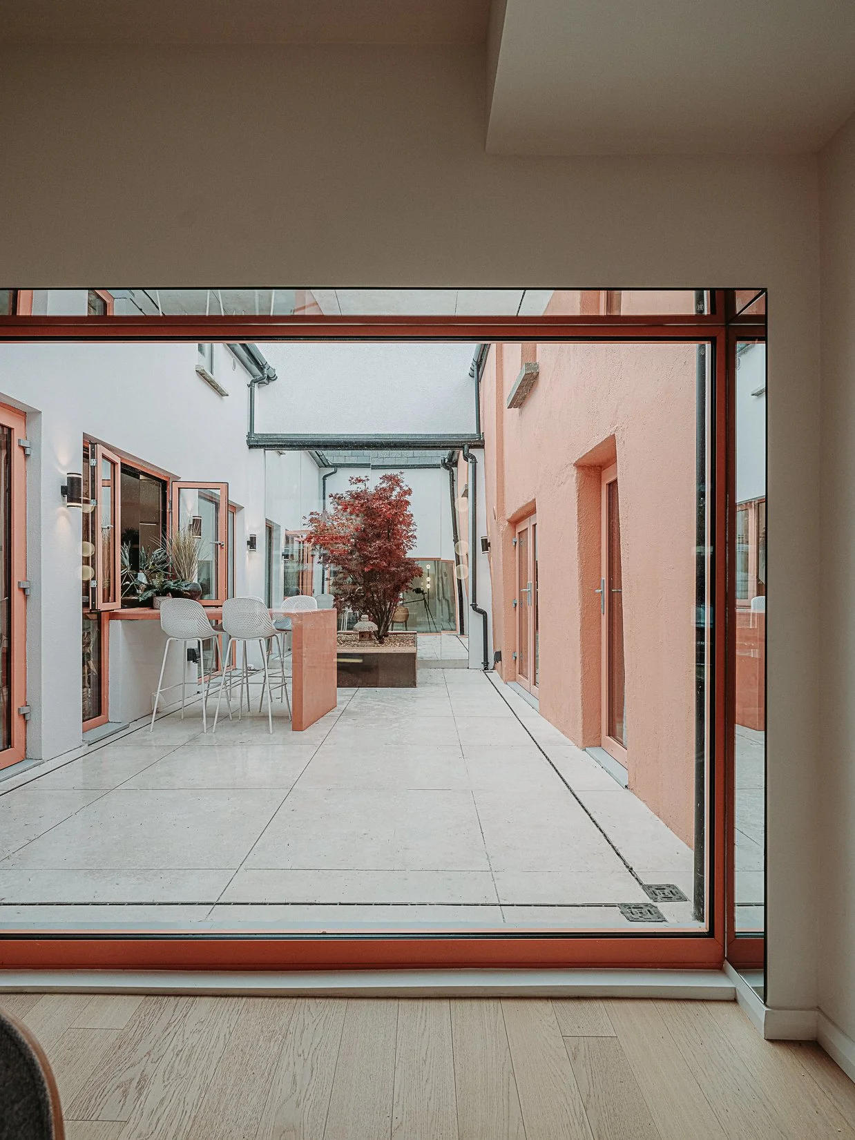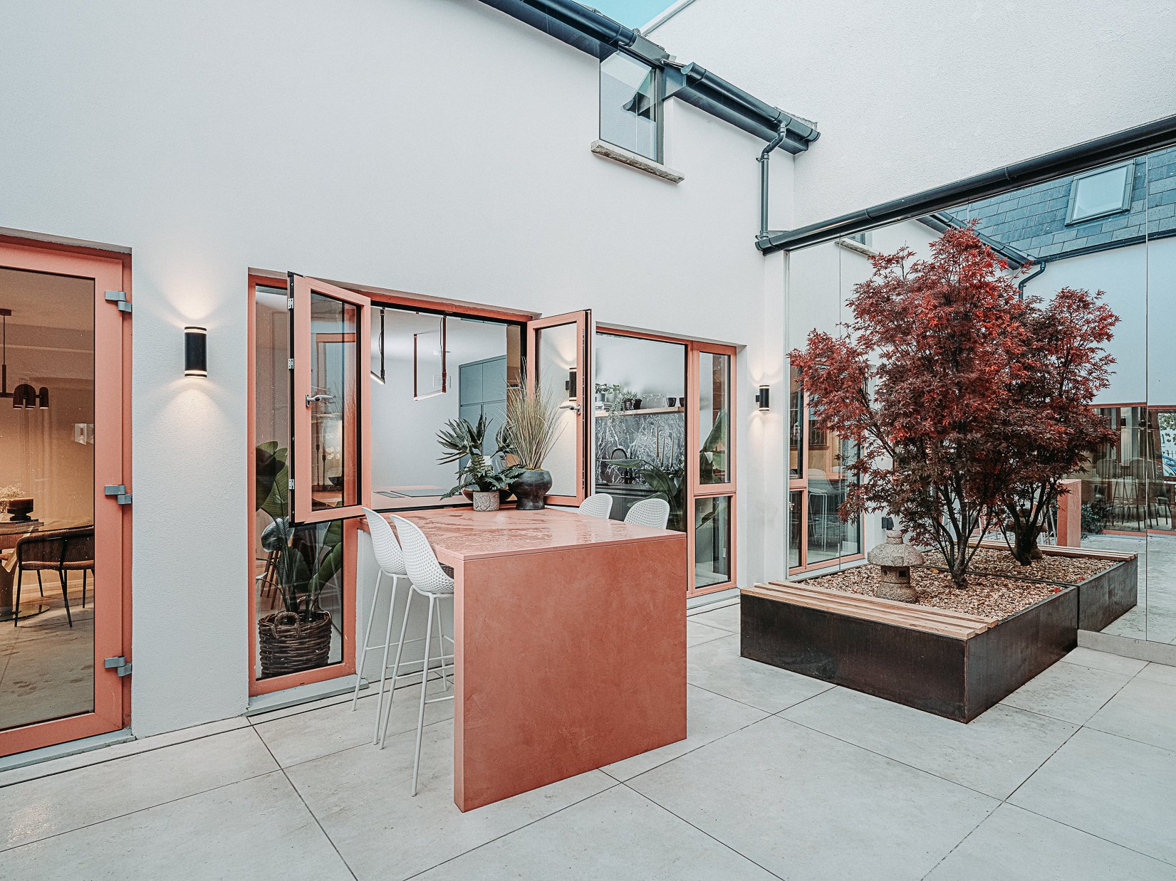 This coral colour is used throughout the house on all window frames and doors as well as the stone for the kitchen island and a double height wall in the extremely unique interior courtyard - bringing a sense of warmth to the home.