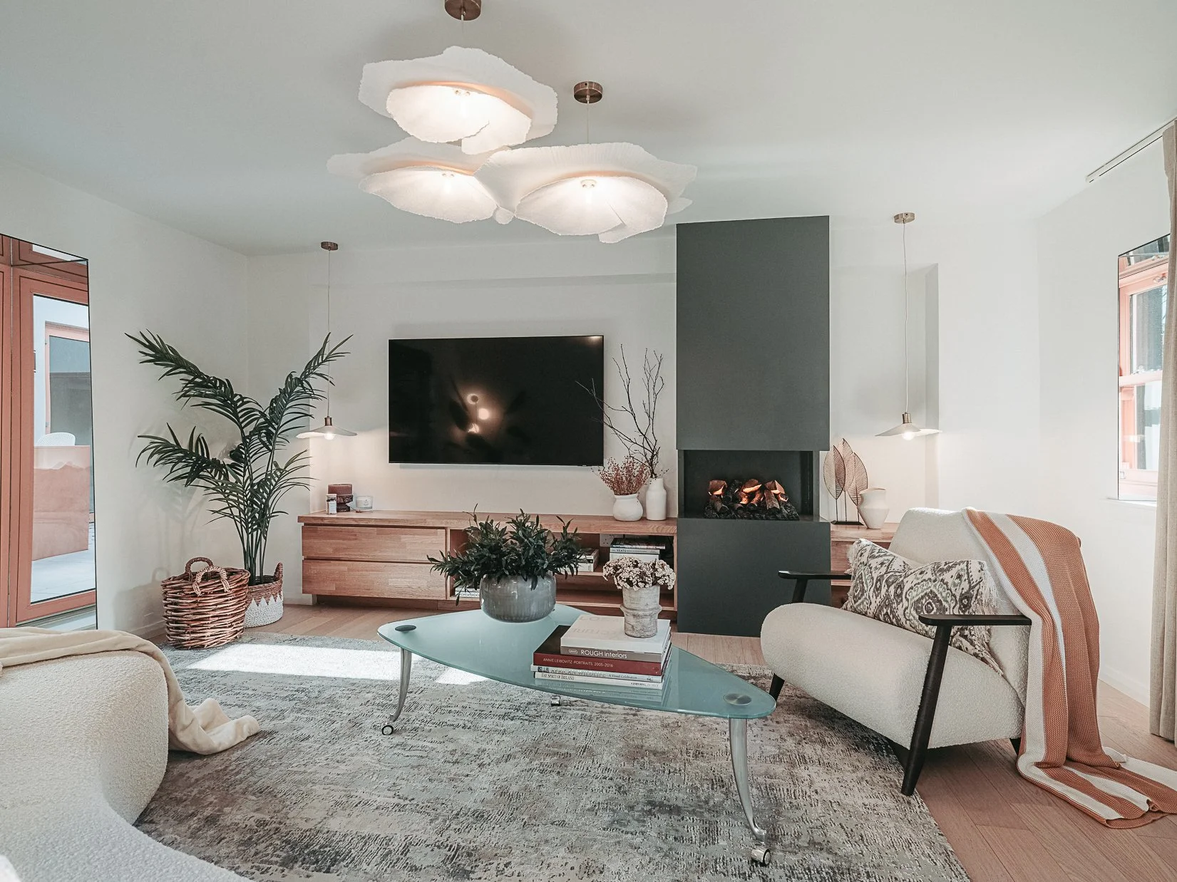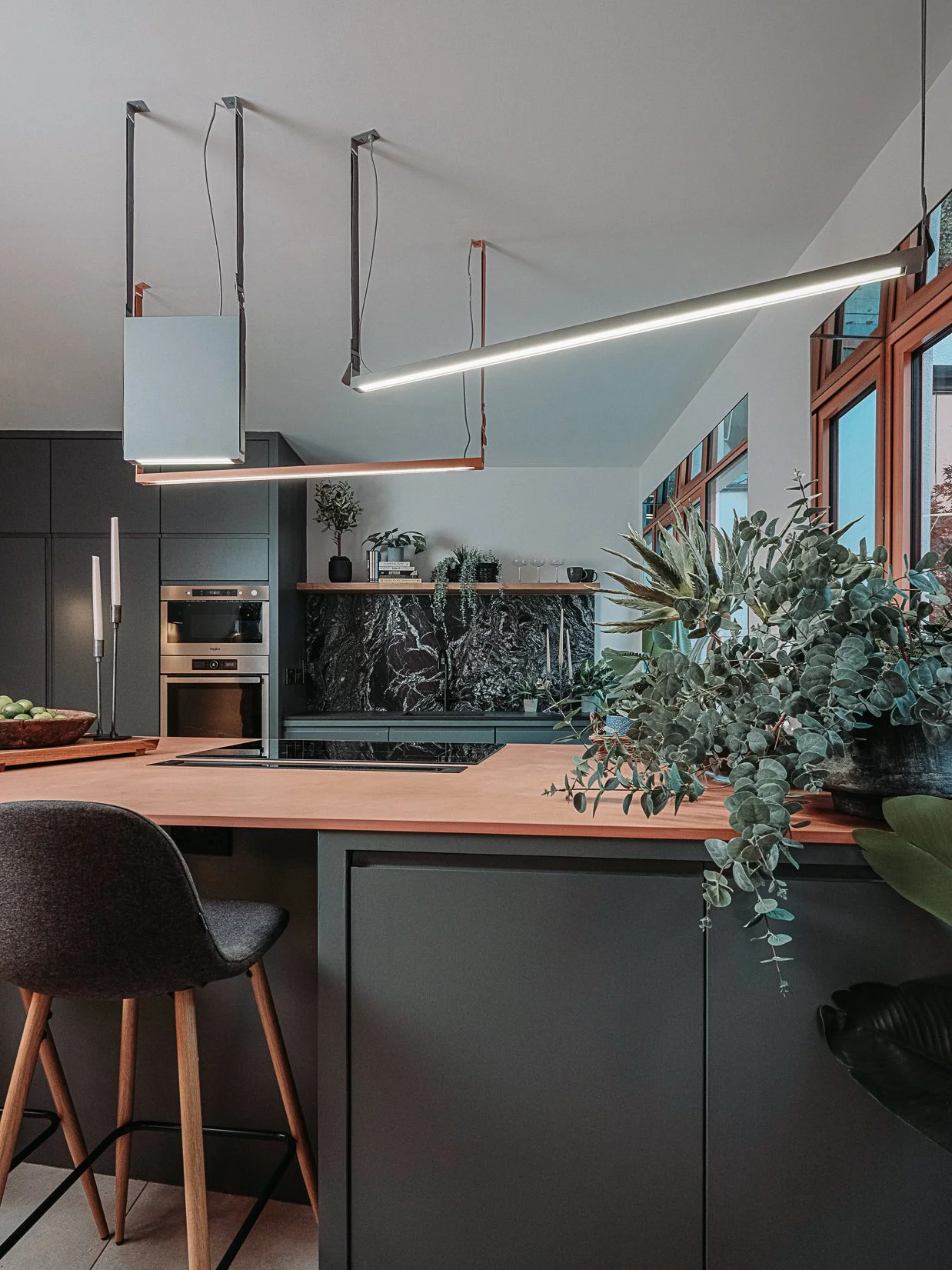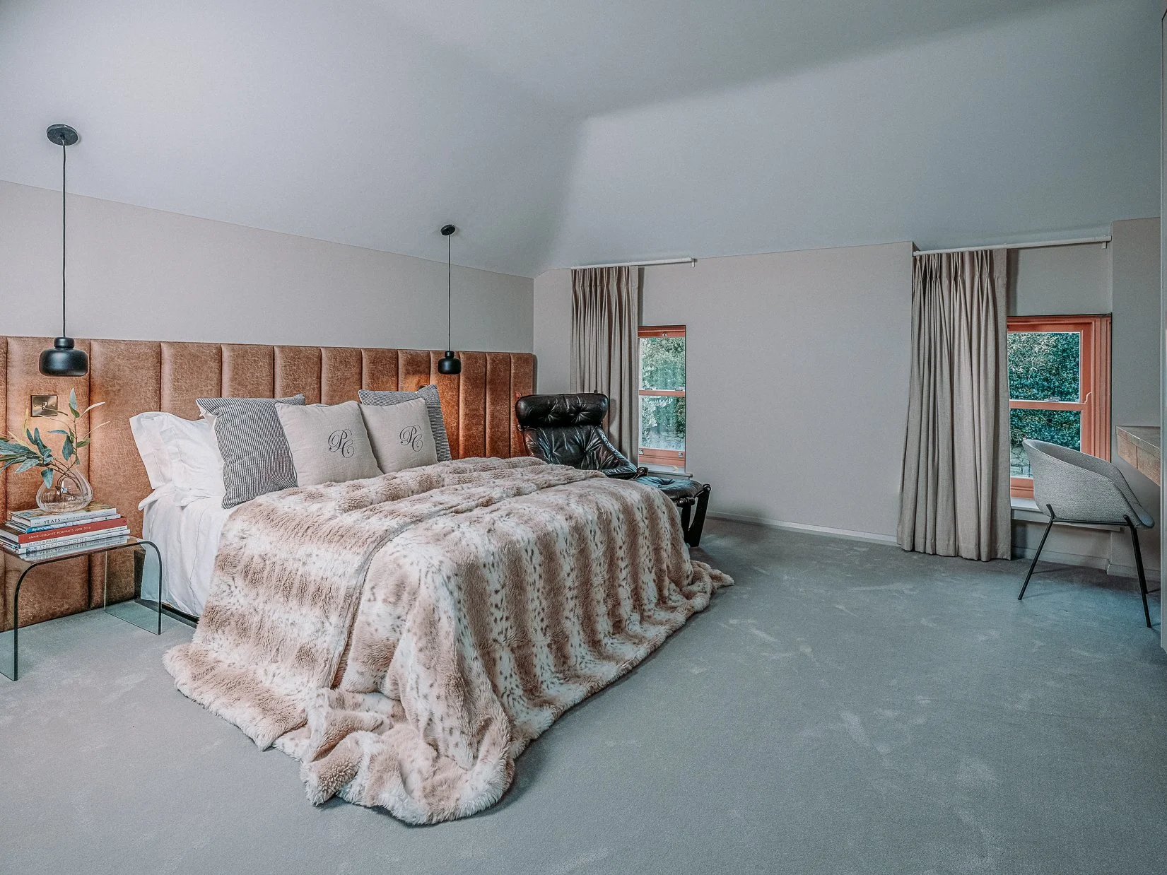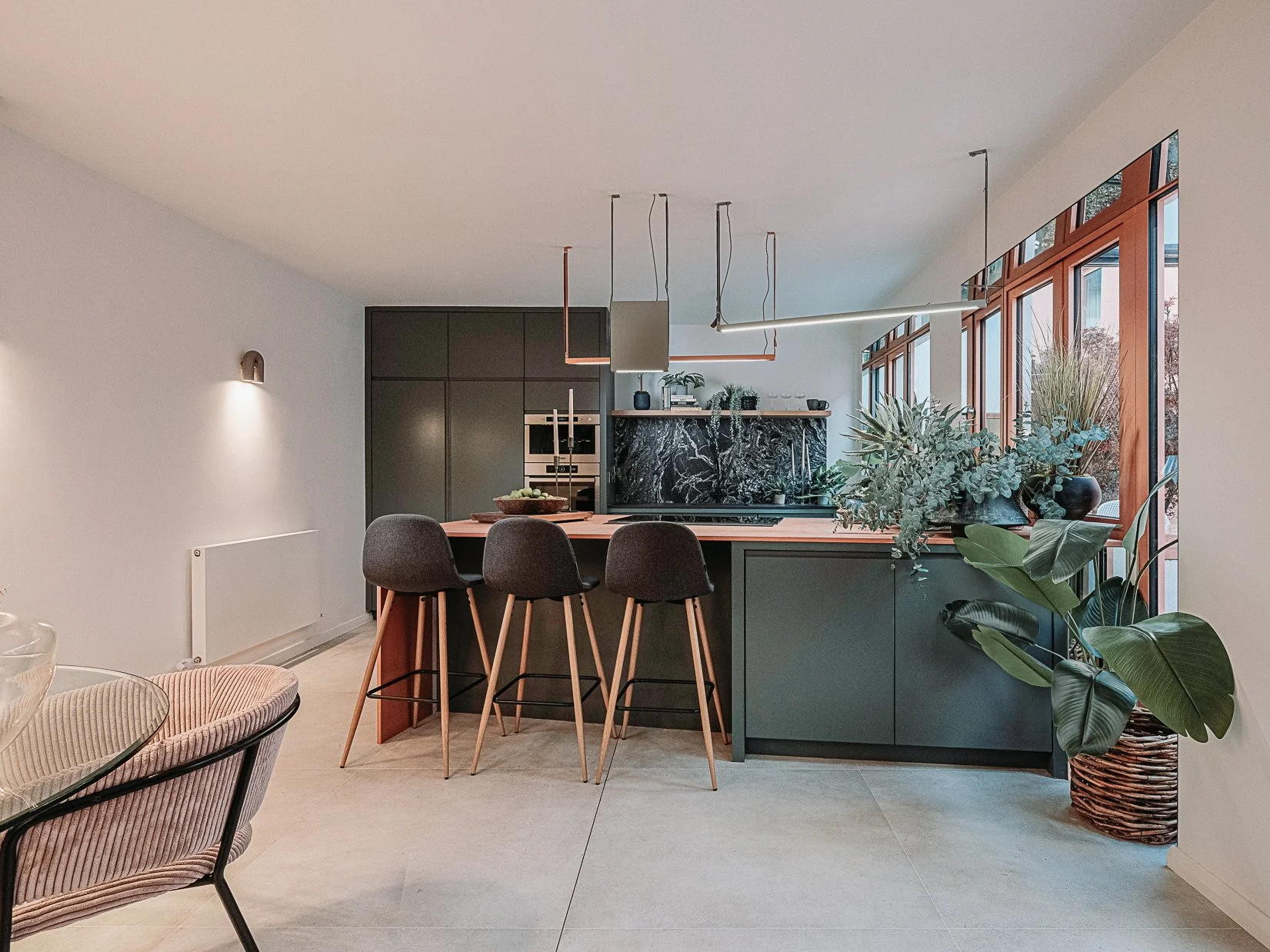 This coral colour is used throughout the house on all window frames and doors as well as the stone for the kitchen island and a double height wall in the extremely unique interior courtyard - bringing a sense of warmth to the home.