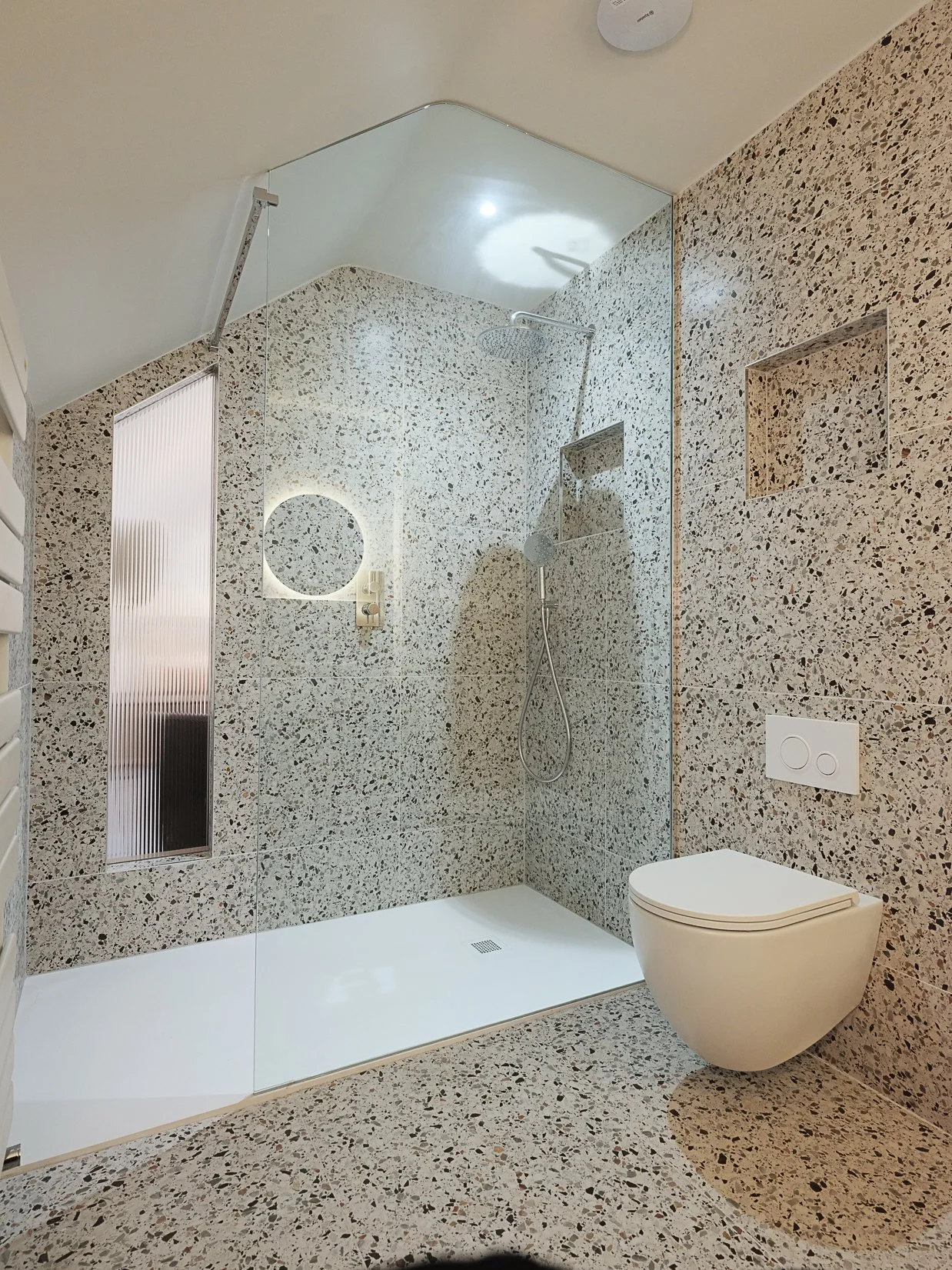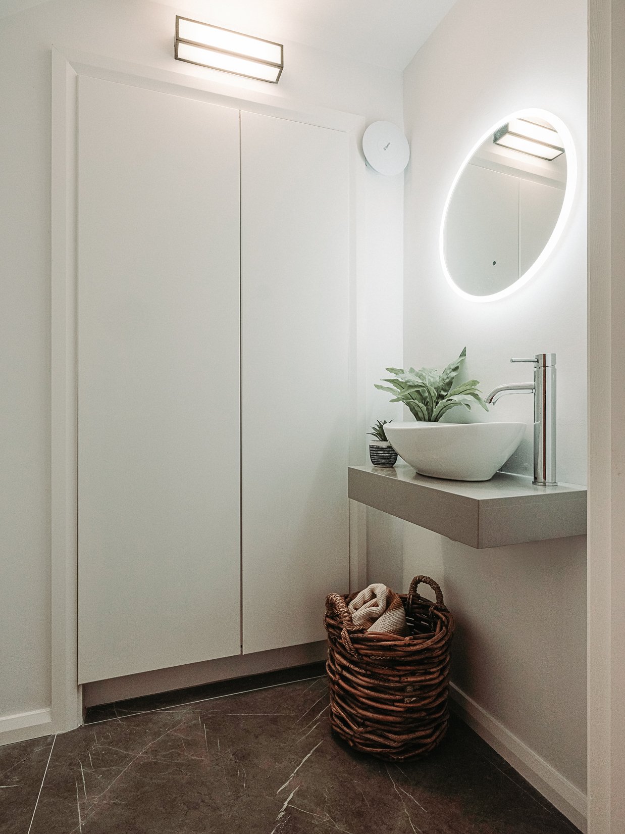 A monochromatic bathroom with a mirror obelisk that disappears almost as soon as you notice it makes for a surreal and unexpected element.