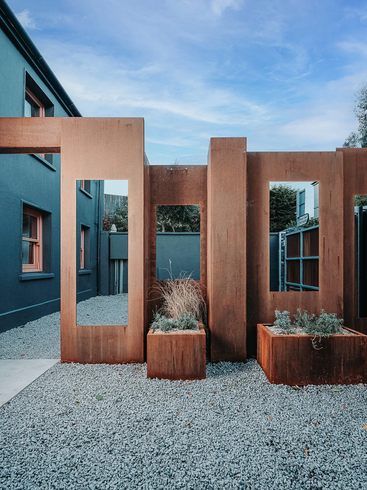 A corten steel structural sculpture sits at the entrance to this house creating a grand entrance to this grand home. The door was another aspect of the conservation architecture that had to remain and was a dichotomy to the grandeur of the home and design.