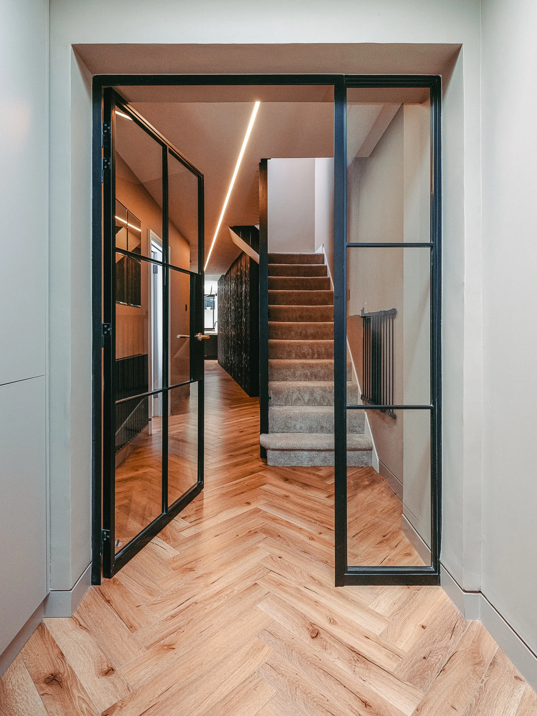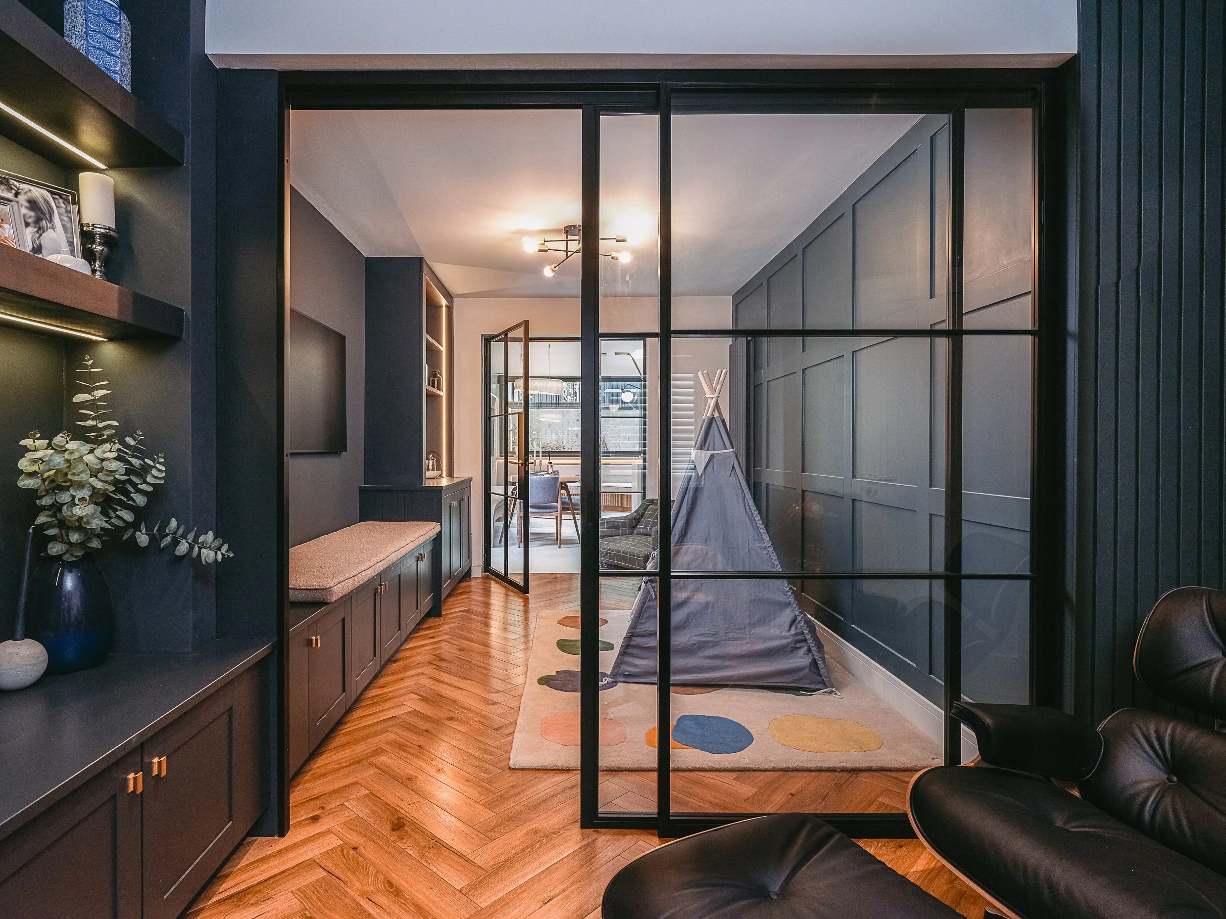 Sitting & Dining Rooms Transformation, turning dated spaces into relaxing and modern interior. Our clients' top priority was to maximise storage and create space to both relax and entertain. We went with a more traditional and darker look for these 2 rooms as a contrast to the rest of the house, and used dark blue and green tones to create a sense of calm in the sitting room. For the kids, we created a separate play area using stylish crittall doors. These provide a sense of independence while ensuring parents can always keep an eye on them. We extended the low built-in storage across the back wall, not only housing all the children’s toys but also providing a seating area for their friends. The crittall doors also allow natural light to flow beautifully from the front to the back of the home, creating a bright and inviting space.
