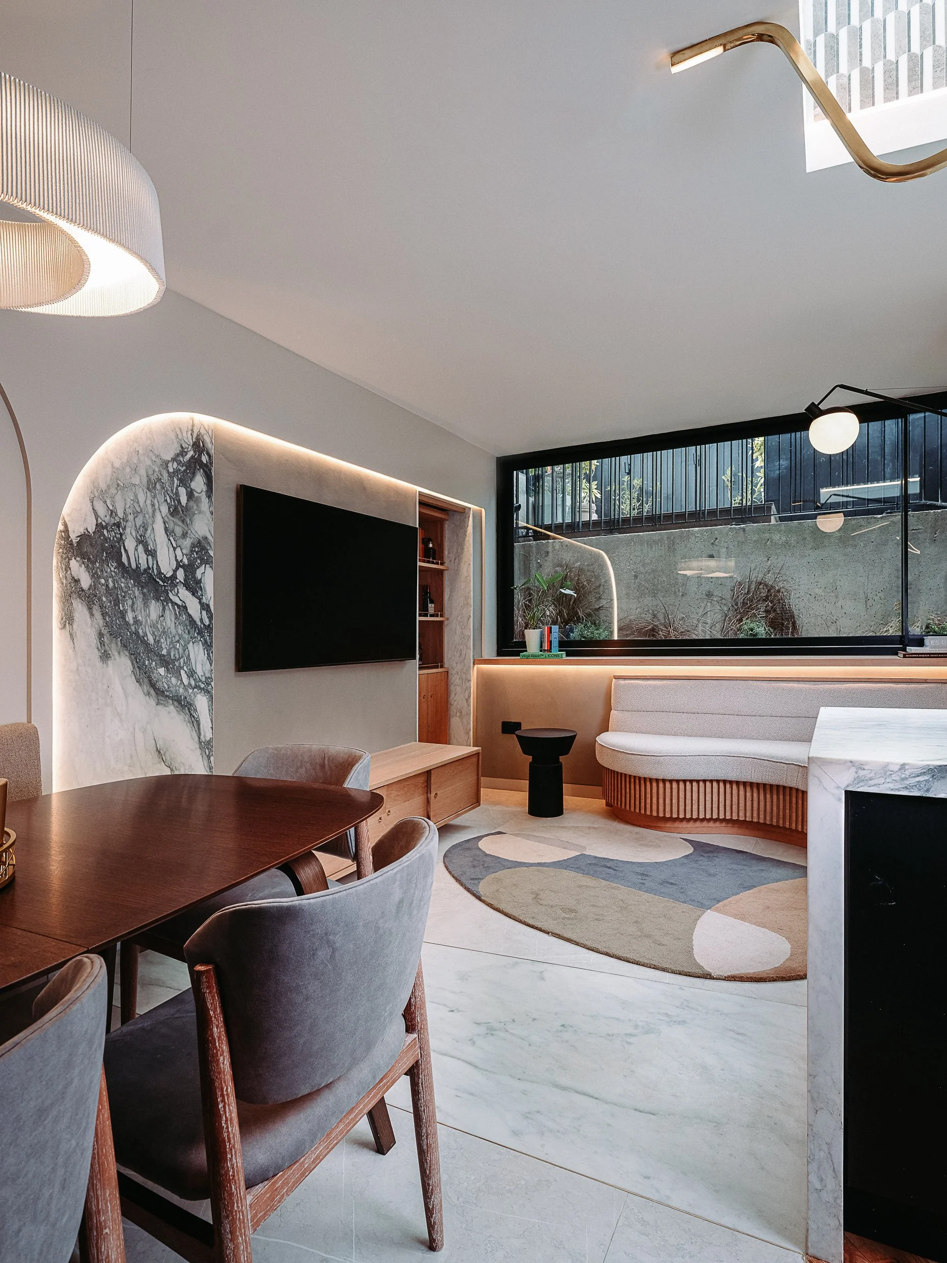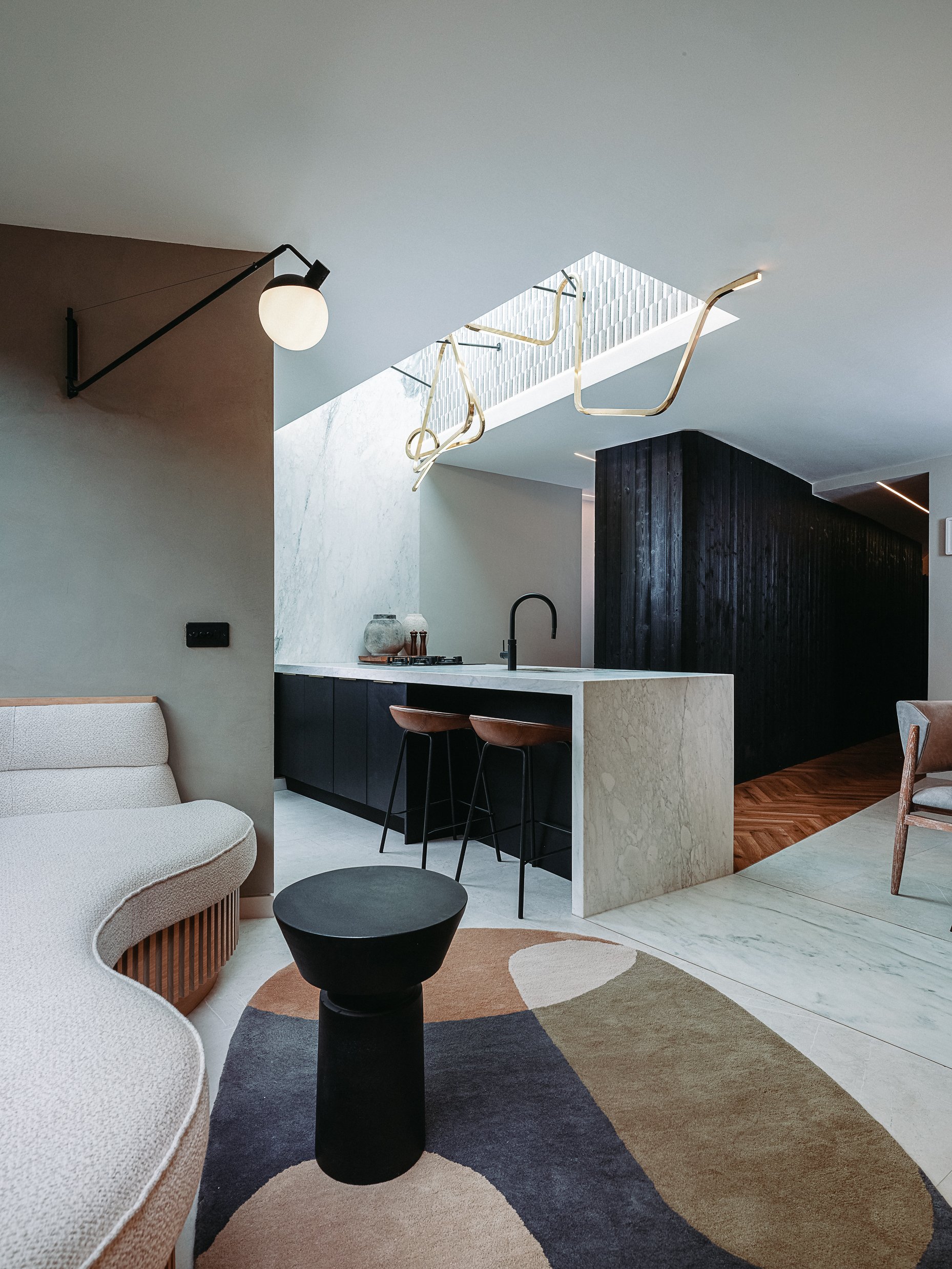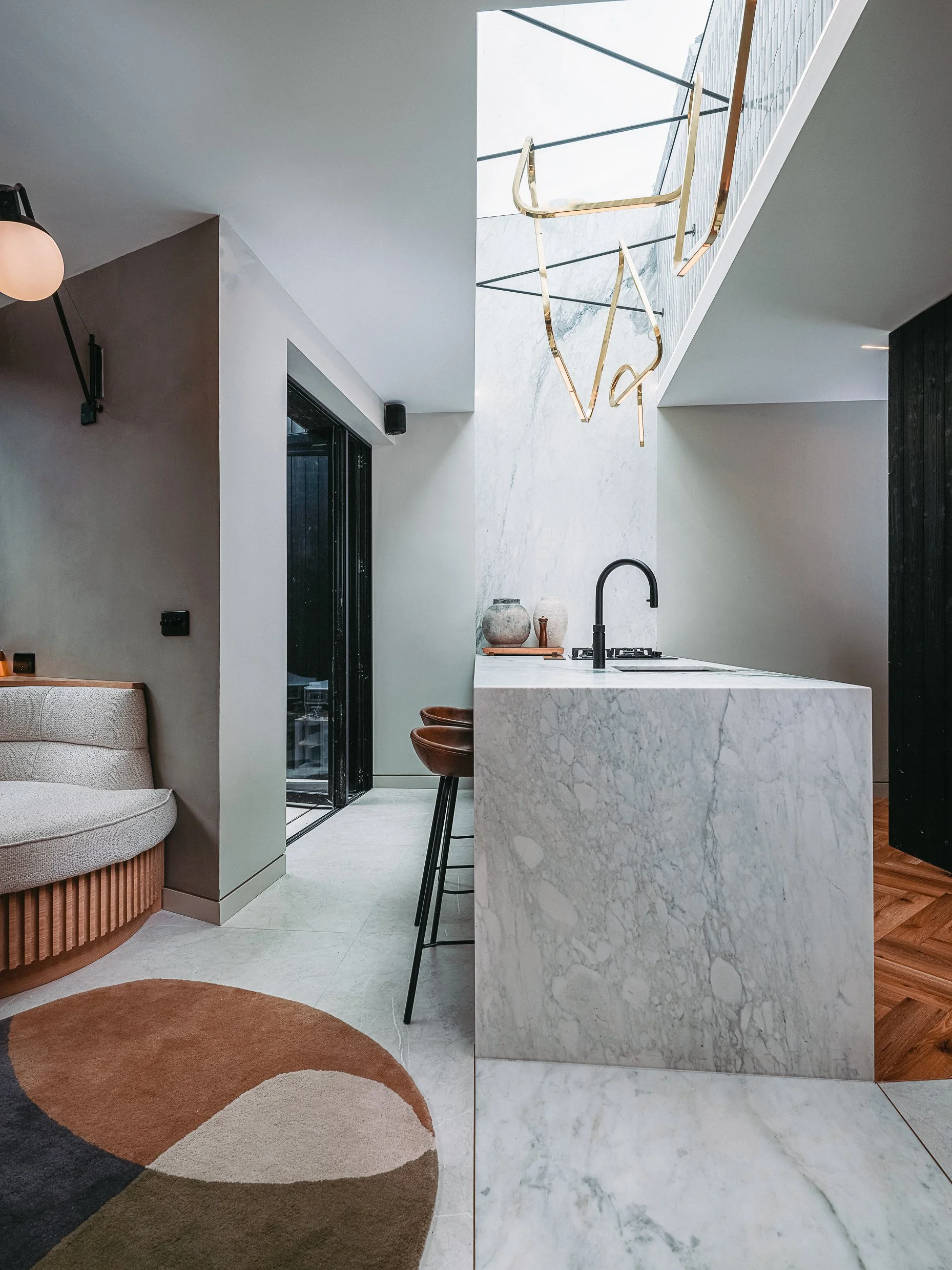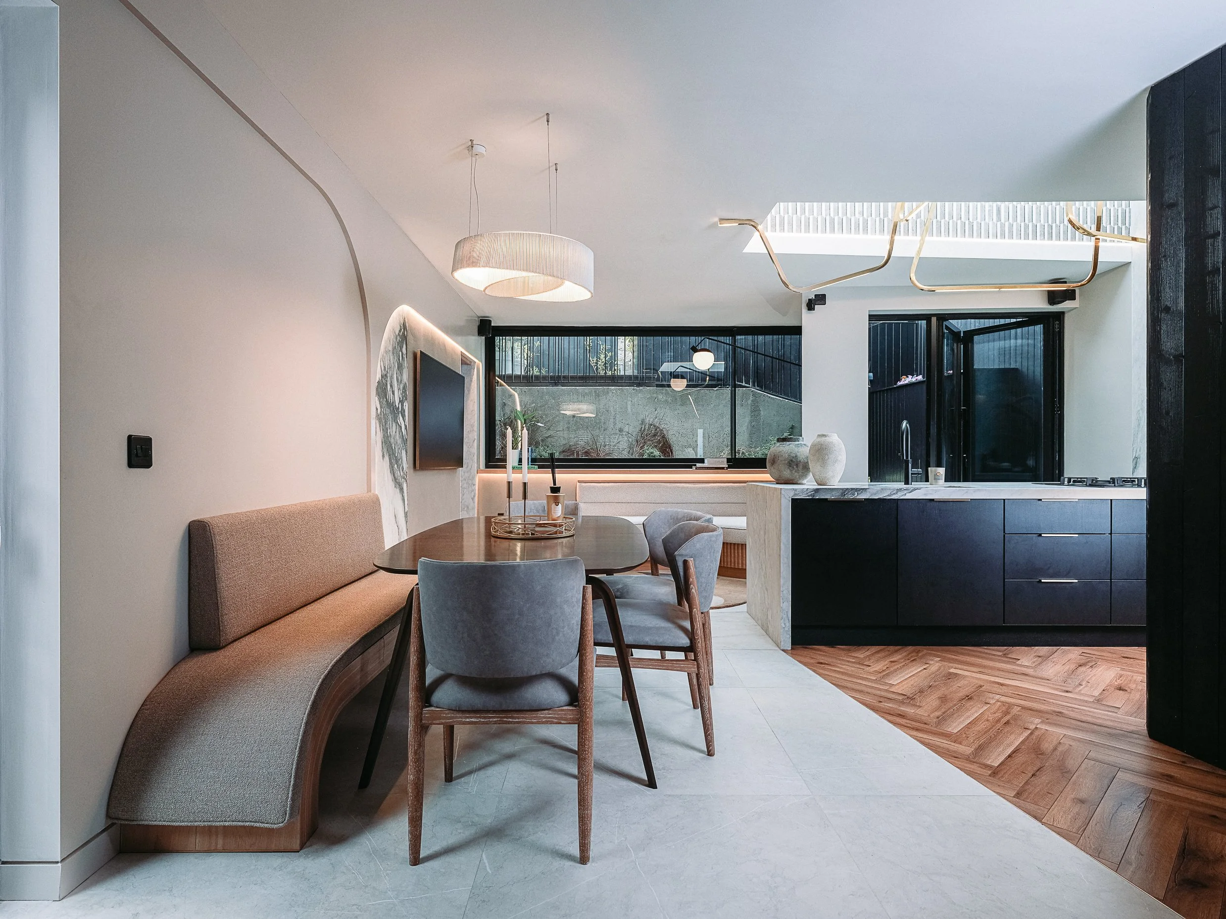 A custom curved lounge seat we designed sits at the window to the left and faces the new space, where a mixture of 5 solid surfaces - charred timber, herringbone walnut, stone tile, Italian marble and venetian plaster - come together in the most unusual way. The marble that runs down 2 walls, across the floor and kitchen island was specially picked and imported from Italy and it visually divides areas within the extension, allowing kitchen, dining and lounge areas to have their own space and character.