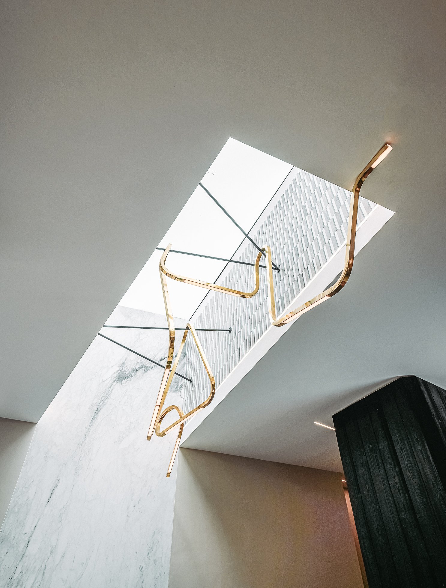 Our vision for the kitchen island light was to flood the space with light during the day and transform it into a stunning, sculpture-like installation at night. This unique light fixture disrupts the straight lines of the kitchen and fills the void above, uniting all elements. Handcrafted from brass, the electrics are seamlessly integrated within, running through the light and suspension bars. Evenly distributed light panels ensure uniform illumination over the kitchen island, while the shape twists and turns, mimicking a metallic cloud floating above. The roof light extends 1.5 meters through the ceiling, creating a surreal infinity effect with no visible glass, adding to the magical daylight source. The internally tiled void completes this mesmerising installation.